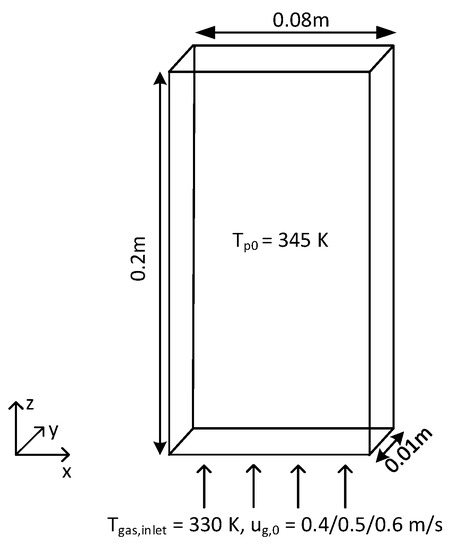 A series of fluidization simulations were performed using the OpenFOAM-CFDEM-LIGGGHTS package (we refer to this package as CFDEM hereafter) of a pseudo-2D fluidized bed, which is schematically presented in Figure 3. Details of the geometry are shown in Table 3. The simulations were carried out with particles of 0.995 mm in diameter, which are classified as Geldart D type particles. Simulations were performed for initial bed heights of 0.04 m (aspect ratio 0.5), 0.08 m (aspect ratio 1) and 0.16 m (aspect ratio 2). The number of particles in the system amounted to 37,225, 74,450 and 148,900, respectively. Free-slip boundary conditions were applied to the front and back walls, and no-slip boundary conditions were used for the left and right walls. Table 4 lists the physical properties of the gas and particles that were used in the simulations.