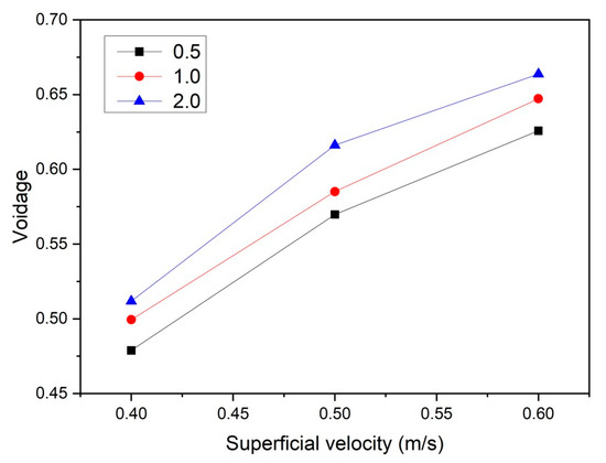 To quantify the effect of the gas superficial velocity and initial bed height on bubble behavior, the temporally and spatially averaged gas porosity was obtained from the last 8 s of simulation data. It was found that 8 s of simulation time was sufficient to obtain well-converged results. In Figure 5, it is shown that the overall mean bed voidage increases more or less proportionally with increasing u0. When the superficial gas velocity increases, the differences of averaged voidage between different aspect ratios increase, which is in line with the observations from Figure 4.