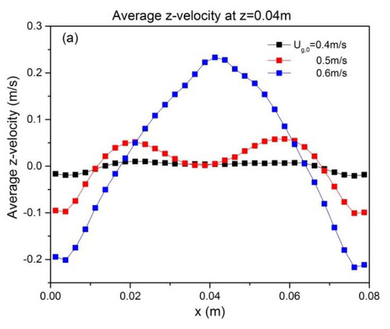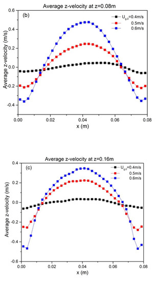 To quantify the effect of ug,0 and H0/W on the solids motion, the temporally and spatially averaged particle velocity was obtained from the last 8 s of simulation data. The time-averaged vertical particle velocities at z = H0, as a function of superficial gas velocity and aspect ratio, are depicted in Figure 6. It can be seen that particle velocity is affected by superficial gas velocity as follows: both the up-flow in the core and the down-flow in the annulus are enhanced. This can be attributed to enhanced bubble action. The bed hydrodynamics is also influenced by the aspect ratio, as indicated by the altered shape of the time-averaged vertical velocity. When the initial bed height increases, the up-flow in the core region becomes larger. This reveals that a higher aspect ratio promotes intensified upward solids motion.