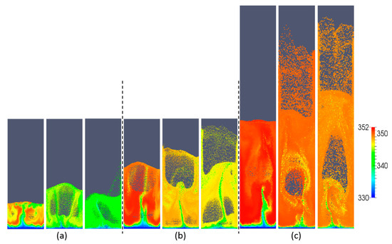 Snapshots of particle temperature as a function of aspect ratio: (a) H0/W = 0.5, (b) H0/W = 1, (c) H0/W = 2, and different superficial gas velocities: 0.4, 0.5 and 0.6 m/s (from left to right).
