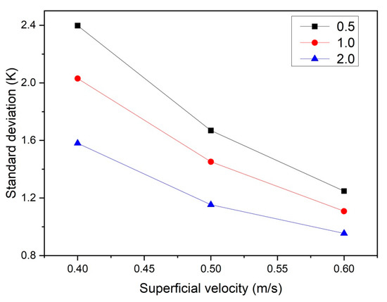 To characterize the bed thermal behavior, the temporal- and spatial-averaged particle temperature was calculated, along with the standard deviation of the particle temperature. Figure 8 shows the standard deviation (defined in Equation (14)) of the particle temperature as a function of the superficial velocity and bed aspect ratio. As can be seen, when the gas superficial velocity increases, the temperature standard deviation decreases in all cases. This can be explained by the fact that at higher u0, the bed is better-mixed and hence becomes more isothermal. Moreover, at higher aspect ratios, the relative influence of entrance effects is reduced and particles become better-mixed, which further reduces the standard deviation of the particle temperature.