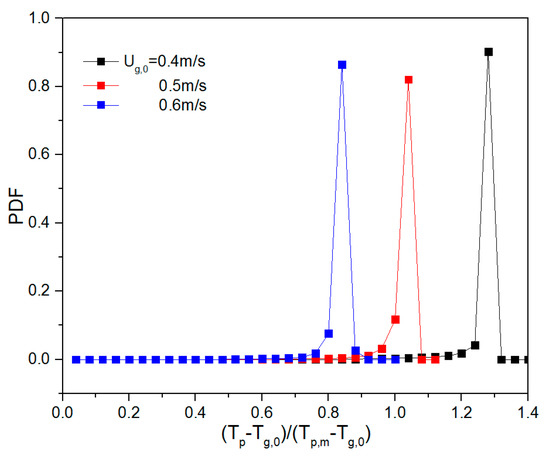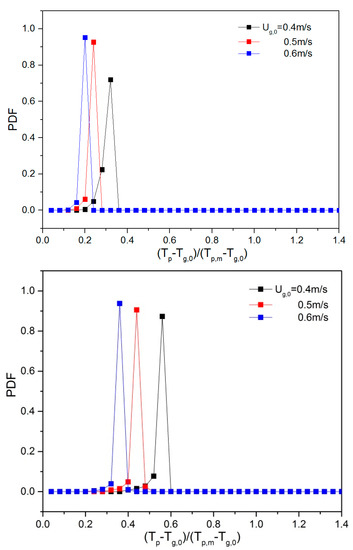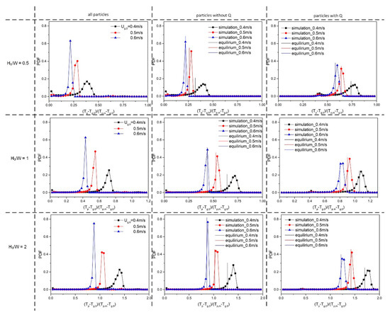 Figure 12 shows the probability density function of the dimensionless particle temperatures, which was created during a period of 10–20 s (in a similar way to that described by Li et al. [13]). The equilibrium temperatures of the (in)active particles are included for reference.