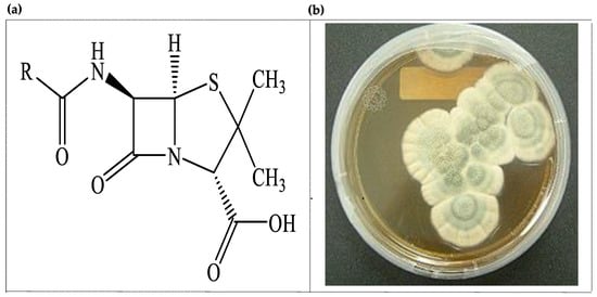 (a) Core structure of penicillin, the first antibiotic from fungus; (b) Penicillium notatum.