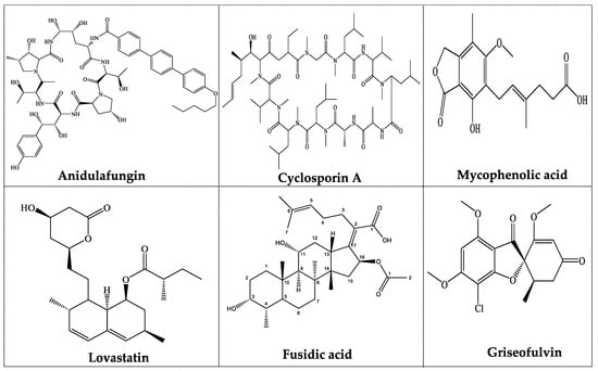 Many therapeutic agents, such as cyclosporine and mycophenolic acid (immunosuppressive activity), fusidic acid and griseofulvin (antimicrobial activity), and other novel semisynthetic antifungal drugs, such as anidulafungin and caspafungin, have been derived from fungal metabolites [45]. Recently, cyclosporine was used to develop Debio 025, which was clinically proven to have potent antiviral activity [46].