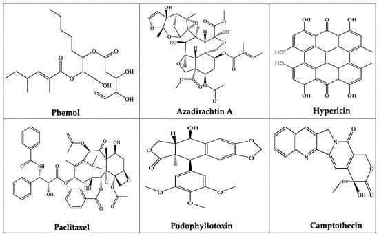 Several endophytic fungi can produce secondary metabolites that are also biosynthesized by their host plants (Figure 3) [60]. These include, for example, antineoplastic paclitaxel [61], camptothecin and its structural analogues [62], the anticancer drug lead compounds podophyllotoxin [63] and deoxypodophyllotoxin [64], the antidepressant hypericin along with emodin [65], and the natural insecticides azadirachtin A and B [55].