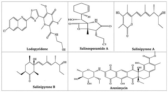 In addition, these actinomycetes have the ability to form stable populations in different habitats and produce many compounds with various activities [126]. This explains the importance of this group as a source of novel compounds. Many novel pharmaceutically important compounds have been produced from marine actinomycetes, such as the anticancer salinosporamide A, which is produced by Salinispora tropica [127]; salinipyrones A and B, produced by Salinispora pacifica [128]; iodopyridone, produced by marine Saccharomonospora sp. [128]; and srenimycin, produced by Salinispora arenicola [129] (Figure 4). Table 2 lists some of FDA-approved drugs from actinomycetes.