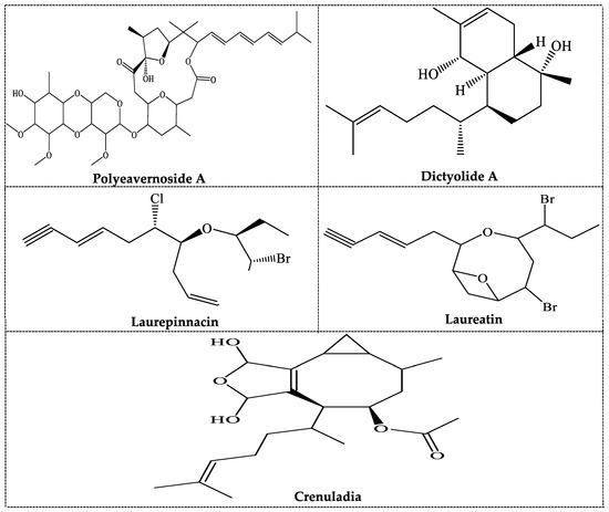 Investigation of natural products from algae started in 1970 [139]. Among the important compounds produced by algae are polycavernoside A from the red alga Polycaverosa tsudai [128]; antitumor active 4-acetoxydictylolactone, dictyolide A, B (diterpenes), and nordictyolide from the brown alga, Dictyota dichotoma [140]; and antimicrobially active crenuladial, which is isolated from the brown alga Dilophus ligatus [141] (Figure 5). However, red algae, especially the genus Laurencia (Rhodophyta), commonly produce halogenated sesquiterpenes and diterpenes [142]. It is worth mentioning that algae are a very extensive source of new insecticides and have replaced chemically resistant synthesized pesticides [143]. Examples of potent insecticides from algae include (Z)-laureatin, laurepinnacin, and 1β-(2-E-chlorovinyl)-2β,4α,5α-trichloro-1α,5β-dimethylcyclohexane and its enantiomer [144].