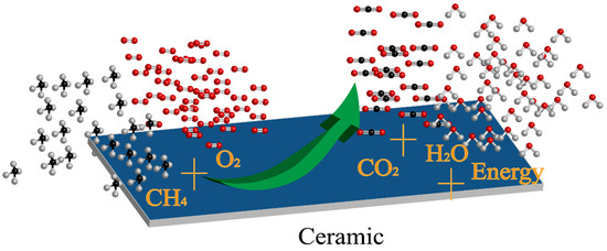 The exothermicity of gas oxidation is complicated. The gas oxidation reaction generates various intermediates, but the final products are generally considered to be water and carbon dioxide [18] (Figure 1). In low-concentration gas heat storage and oxidation utilization technology, gas is heated to more than 700 °C by a high-temperature heat storage ceramic and heat is released by super enthalpy combustion. The chemical reaction equation is as follows (1):