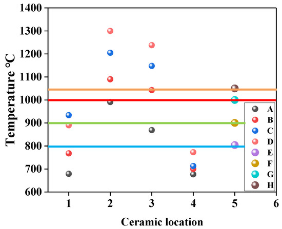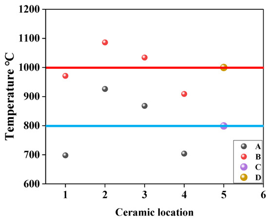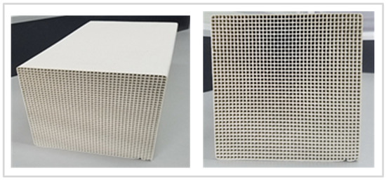 To improve the heating capacity of the equipment and ensure that the equipment can provide a stable high-temperature environment, high-temperature ceramics were installed in the reactor (Figure 2). The maximum temperature of this experiment was 1000 °C and the preheating temperature of the heat storage body should be higher than this temperature. Therefore, a square of corundum mullite material was used (Table 1), which has a maximum service temperature of 1500 °C.