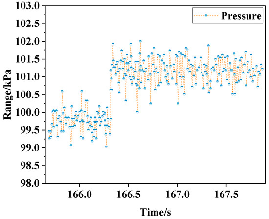 Figure 6 is the actual measurement of flashover air pressure. It can be seen from the Figure that the initial measured flashover pressure fluctuated steadily around 99.75 kPa, but the pressure increased significantly around 166.33 s and fluctuated steadily again around 101.25 kPa after the pressure spike. Since the ceramic is affected by the airflow during the evacuation, the temperature will be significantly reduced and recovered in a short time. After flashing air, the pressure in the chamber increased with the temperature recovery and air expansion after heating. A spiking value was detected in the pressure. The pressure after the air flashing was 101.4 kPa.