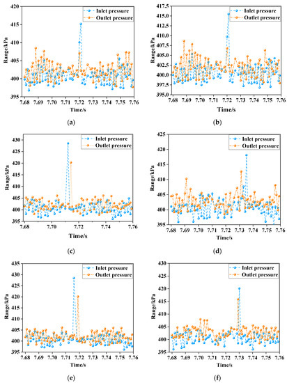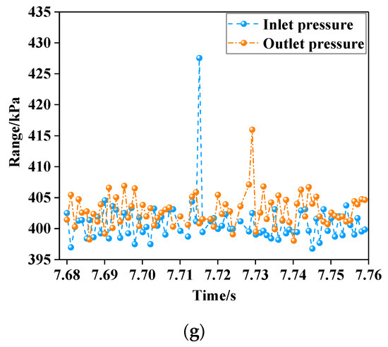Figure 7 is the experimental pressure chart. a–g show the pressures of air (a) and gas concentrations of 1.00%, 1.10%, 1.20%, 1.30%, 1.40% and 1.50%, respectively, at the inlet pressure of 400 kPa and the measured ceramic temperature of 900 °C. Figure 7 is a data fragment from a large amount of data, mainly due to a jump in pressure detected near the fragment. We analyzed a small portion of the maximum jump value and showed the volatility in detail. It can be seen that when the inlet pressure was constant, the pressure change when passing air or gas was almost the same, without a detected difference. A peak appeared in the air pressure curve, which was ascribed to the rapid air expansion after the ceramic temperature recovered, but the expansion range was small and the inlet and outlet pressures returned to normal as the air concentration increased. The pressure change curves of different concentrations of gas were similar to a maximum peak. Their increase ranges were greater than those of air because gas enters a high-temperature environment and is oxidized to generate water and carbon dioxide, and releases heat. The volume of gas expands when absorbing heat. However, the generated carbon dioxide and water vapor are mixed with gas, which reacts with oxygen at high temperatures to continuously generate more intermediates. As the reaction proceeds, more carbon dioxide and water vapor are generated, which suppresses the increase in pressure and eventually the pressure becomes normal. The overall fluctuation range of the inlet and outlet pressures was small, indicating that the gas in the reactor did not have a sudden volume expansion and a sudden pressure increase caused by oxidation. When gas is exposed to a high temperature, it reacts with oxygen to generate carbon dioxide and water vapor. A small amount of carbon dioxide and water vapor are mixed with the gas and continue to react with the gas, affecting the gas explosion limit. It can be seen from the figure that, compared with air, the gas mixed with a small amount of carbon dioxide and water vapor has a relatively stable reaction process, with no significant increase in pressure, indicating that the explosion limit of low-concentration gas changes slightly after mixing with a small amount of impurity gas. There was no instantaneous explosion in the instantaneous jump of pressure.