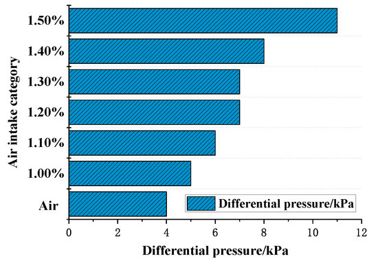 Figure 9 shows the pressure difference between the inlet and the outlet. It can be seen that the air pressure difference was the smallest, indicating that the air has a smaller expansion volume when heated and has a lower risk of explosion. The maximum pressure difference of gas at a concentration of 1.5% indicates that the methane gas was instantaneously heated when passing through a high-temperature heat source. The gas expansion is caused not only by the expansion of its volume but also by the gas reaction that generates water vapor, carbon dioxide and heat. The volume of gas was significantly increased, with a maximum pressure difference of 11 kPa when exiting the reactor. The pressure difference of gas was greater than the pressure difference of air when passing through the high-temperature heat source. The pressure difference of gas exhibited an increasing trend with the increase in the concentration, which indicates that the increase in the concentration enables the gas to tend to approach the pressure spike when passing through the high-temperature environment of 1000 °C. The difference in the pressure difference between 1.4% and 1.5% gas after thermal oxidation was greater than that when the gas concentration increased by 0.1%, indicating that the pressure difference changed more drastically when the gas concentration exceeded 1.4%. During the gas concentration’s increase from 1% to 1.5%, the pressure difference did not change much, indicating that the pressure did not spike instantaneously.