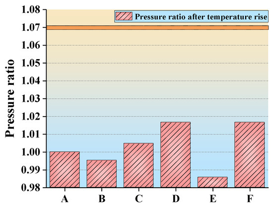 Figure 10 shows the ratio of gas outlet pressure to air outlet pressure at different concentrations. A, B, C, D, E and F represent the ratios of gas outlet pressure to air outlet pressure at concentrations of 1.00%, 1.10%, 1. 20%, 1. 30%, 1.40% and 1.50%, respectively. It can be seen that the ratio of the gas outlet pressure to the air outlet pressure was very different at different concentrations. The minimum value was observed at point E, indicating that the measured gas concentration is the safest at 1.40% and the possibility of gas explosion is the minimum. The same maximum value was observed at points D and F, which indicates that a gas explosion is most likely and the most dangerous when the measured gas concentrations are 1.30% and 1.40%. However, the measured data points are far less than 1.07, indicating that there is no danger of explosion in the measured concentrations of gas. This result demonstrates that there is no explosion risk in the gas concentration range of 1–1.5%, in which the gas in the reactor is oxidized rather than exploding. The gas is fully oxidized without risk of explosion, which affords a high-temperature heat source. When using low-concentration gas from mines in the future, we can control the gas concentration to below 1.5% with mixed air to achieve the safe and efficient utilization of low-concentration gas.
