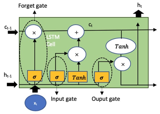 where denotes the hidden-output weight matrix, denotes bias vector and denotes the hidden vector and is computed from the LSTM cell (block). A common LSTM block illustrated in Figure 3. An LSTM cell has three gates: an input gate to identify important information and preserve it in a long-term memory called the cell state , an forget gate to decide what information needs to be forgotten from the previous cell sate and an output gate to decide what to send to the next sequence.