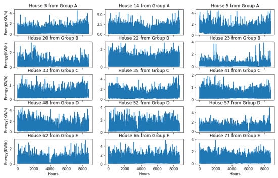 Hourly energy consumption of sample houses in different groups over one year (2013).