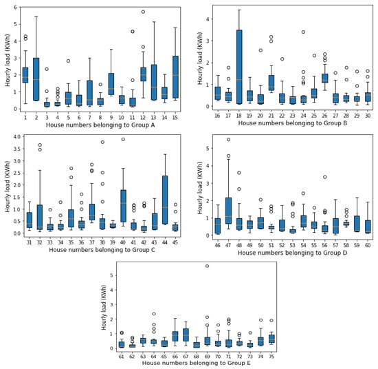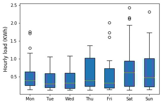 Figure 5 and Figure 6 provide more insight into the load volatility of the house profiles using box-plots statistics []. The boxplots provide information on the median value and variability of the consumption values. Figure 5 shows how the hourly energy load of one house changes during different days of a week. For example, this house has experienced high variations in hourly consumption during the weekend and on Thursday than the other weekdays. Moreover, the median value of energy consumption has been increased over the weekend. The bobbles in the plot indicate that a few consumption values are out of the maximum range; Q3 + 1.5 ∗ (Q3 − Q1) [] which can be considered as outliers. For instance, on Saturday, there have been recordings higher than 1 + 1.5 ∗ (1.0 − 0.3) = 2.05 KW/h showing by bobbles.