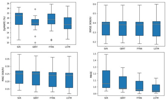 Except for the SVR which slightly overestimates the real consumption values in most houses, the other three models mainly demonstrate a good match and steady weekly prediction for the one-hour ahead estimation. Figure 9 provides more insights into the variability or dispersion of error metrics which were averaged over all profiles and compared among different ML models.