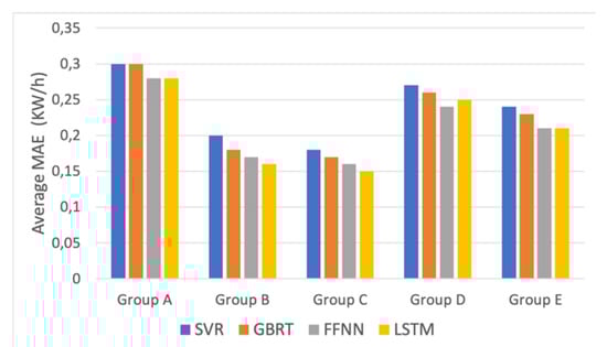 Another comparison is carried out by considering the diversity of consumer groups. Figure 10 shows the average mean absolute error in five distinct customer groups. The prediction error for the house profiles belonging to group A was the highest, while in the other categories it reduced between 2% and 15%. Groups B and C show the lowest values for different models out of all the other groups. It also confirms the lower average prediction error as FFNN, and LSTM were used as the prediction algorithms. The superiority of these models in hourly prediction is also visible for the test houses in other customer groups. Overall, we can conclude that the forecasting task in group A and group D is more challenging due to high average consumption over a year as well as high hourly load variations. The models in groups B and C, on the other hand, obtained higher accuracy due to the lower load volatility and lower average yearly consumption of the house profiles. These customers have shown the most predictable profiles. The interesting finding is that the consumption behavior of the houses belonging to group E with the lowest average consumption and the lowest daily variations were still difficult to predict. The probable reason is that the majority of houses in the training phase, on average, have experienced higher hourly energy consumption than these test profiles. Therefore, the trained models could not learn their consumption behavior properly.