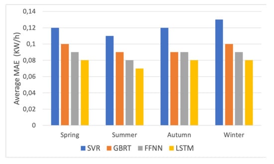 The final analysis was performed to evaluate the effect of temperature and seasonal events on the prediction accuracy of various techniques. Figure 11 shows the average MAE of four techniques over all test houses in four consecutive seasons of the Year 2013. It is evident from the chart the SVR produced the highest error than the other three models over the seasons, though its estimation error reached the lowest (around 0.07 KW/h) in the summer. The other three models also predict summer load with the highest accuracy. The forecasting error during spring and autumn increased for the most models by around 10%. In winter the SVR and GBRT had another 10% increase, while FFNN and LSTM seemed more adaptable to seasonal change and their error remained unchanged.