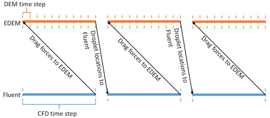 Matte settling through the slag was also investigated with CFD coupled to a discrete element method (DEM). With the CFD–DEM method, individual droplets can be simulated by approximating them as soft spheres that are affected by slag flow. In the coupling, CFD is used to calculate the slag flow and drag forces for each droplet, while DEM is used to solve the contact forces and movement of the droplets. Additional models can be used to take more complex phenomena, such as coalescence, into account. CFD and DEM are not computed simultaneously; instead, first CFD solves one time step and transfers the drag forces to DEM, which then calculates until the CFD time step is reached and returns the droplet locations to CFD. Generally, DEM calculates several time steps between each CFD time step as the CFD time steps are longer. The basic principle of CFD–DEM simulation is illustrated in Figure 2.