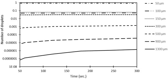 The volume fraction distribution curves presented in Figure 5 show that most of the droplets are between 200 μm to 400 μm. The peak of these curves is usually achieved at around 300 μm. This is also an indication that the transition to large droplets above 400 μm is significantly low.