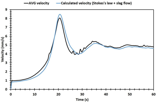 The funneling effect and coalescence together formed a kind of feedback loop. Coalescence increased the droplet size which increased drag, and subsequently strengthened the funneling effect. The effect caused the droplets to move closer to each other, which consequently increased the coalescence rate. Both phenomena increased the settling velocity. The results were in good agreement with the values calculated by combining the average slag flow velocity and Stokes’s law velocity of an average-sized droplet.