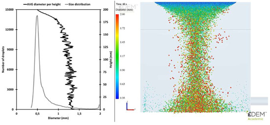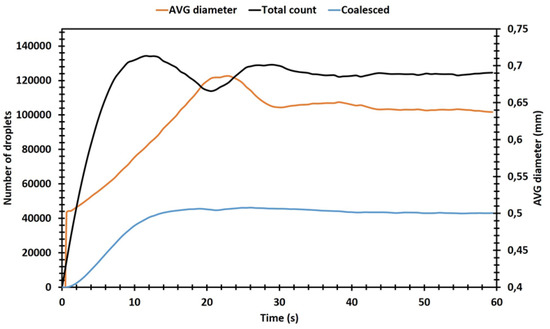 In CFD–DEM simulation, coalescence was calculated using the bubble coalescence probability by Wang et al. [31], which was calculated for every droplet–droplet contact. If the probability was at least 50%, the droplets were considered to have coalesced.
