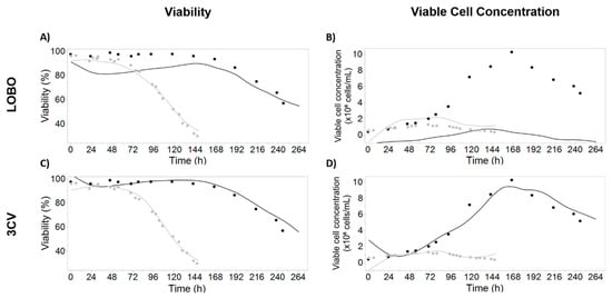 Viability (left) and viable cell concentration (right) predictions using leave one batch out (LOBO, top) and 3-fold cross-validation (3CV, bottom) models. Growth batch is represented in black and infected batch is colored in grey. The lines represent model-predicted values; the filled circles represent reference data; the empty circles were considered outliers and excluded from modeling. For LOBO models, the lines represent the prediction obtained with the model calibrated in the remaining batch. For 3CV models, the lines represent the model built using data from both batches. (A) Observed and predicted values for viability using LOBO for model validation; (B) Observed and predicted values for viable cell concentration using LOBO for model validation; (C) Observed and predicted values for viability using 3CV for model validation; (D) Observed and predicted values for viable cell concentration using 3CV for model validation. Model parameters and coefficients are presented in Table S1.
