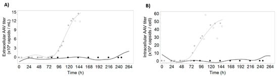 AAV titer predictions for both batches. The growth batch is represented in black and the infected batch is colored in grey. The lines represent model-predicted values; the filled circles represent reference data; the empty circles represent datapoints considered outliers and excluded from modeling. Models were calibrated using the reference data for both batches (filled circles). The prediction data represented by the smooth lines were obtained by applying the model to the real-time differential digital holographic microscopy data. (A) Observed and predicted values for extracellular AAV titer; (B) observed and predicted values for intracellular specific AAV titer. Model parameters and coefficients are presented in Table S1.