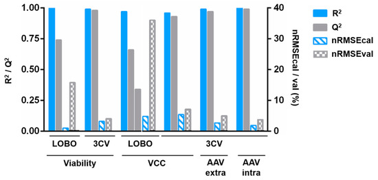 Quality characteristics overview for the models presented in Figure 1 and Figure 2. R2 and Q2 are the correlation coefficients of calibration and validation, respectively. Also depicted are the normalized root mean squared errors (nRMSE) for calibration and validation which are scaled by the variable range. For the LOBO viable cell concentration models, the difference in the cell concentration ranges and the fact that the prediction models overfit the calibration batch result in a negative Q2 (−0.69) when data from both batches are considered. As such, we chose to depict the Q2 for each batch separately (0.66 for prediction of growth batch and 0.34 for prediction of infected batch). CV—3-fold cross-validation; LOBO—leave one batch out; R2—correlation coefficient of calibration; nRMSE—normalized root mean squared error; Q2—correlation coefficient of validation; VCC—viable cell concentration. Raw data are provided in Table S3.