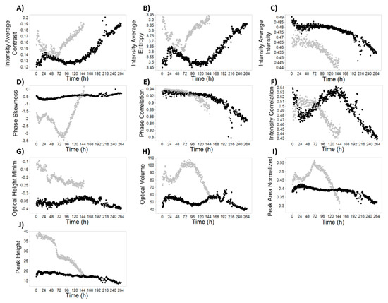 Time-course profiles for selected DDHM attributes. The growth batch is represented in black, while the infected batch is colored in grey. Measurements were obtained every 30 min. (A) Intensity Average Contrast; (B) Intensity Average Entropy; (C) Intensity Average Intensity; (D) Phase Skewness; (E) Phase Correlation; (F) Intensity Correlation; (G) Optical Height Minimum; (H) Optical Volume; (I) Peak Area Normalized; (J) Peak Height.