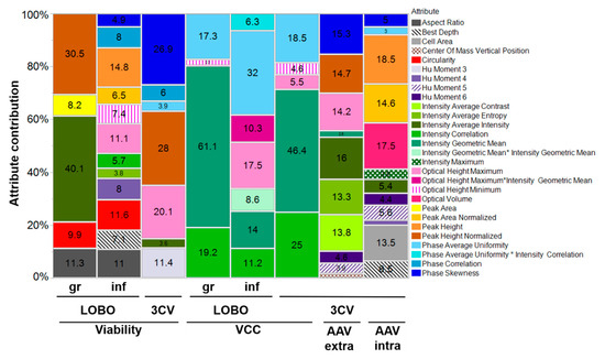 With iLine F, more than 60 attributes are calculated per cell. These are related with the cell morphology (e.g., “circularity”), the light optical characteristics (e.g., “maximum intensity”), the light phase texture (e.g., “phase skewness”) or the light intensity texture (e.g., “intensity correlation”). Overall, the parameters with a larger contribution for the obtained models are related with light intensity and phase characteristics (Figure 5).