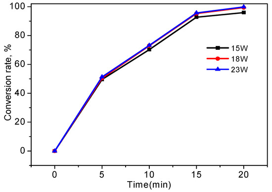 For the UV intensity, according to the Lambert law, UV lamp power and distance between UV lamp and reactor are the main two factors affected the UV intensity and photolysis rate. For the convenience of investigation, the distance between UV lamp and reactor (2 cm) was fixed at first, and then three types of UV lamps with different power (15 W, 18 W and 23 W) were used and investigated under the conditions of carbamide solution with concentration of 1 mg/L, reaction temperature of 30 °C, without the addition of sodium hydroxide. Results are shown in Figure 4.