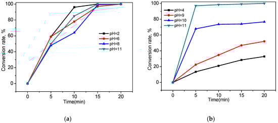 It can be seen from Figure 5a that the carbamide can be quickly digested under both alkaline and acidic conditions, and the carbamide has the highest digestion efficiency with the pH at 2, which mainly due to the higher oxidation-reduction potential of ozone under acidic conditions (E0 = 2.07 V) than that under alkaline conditions (E0 = 1.24 V). Whereas, OH can promote the generation of •OH under alkaline conditions, so that the synergistic effect of the reaction process is enhanced [45] when pH at 11. When the pH is at 6, reactions remained the same conversion rate as that of pH at 2 in the first 5 min, but it declined quicker in the rest of reaction time. It may be explained that: under acidic condition and UV radiation, O3 dissolved in aqueous solution can form the intermediate products of H2O2, which can be motivated by UV to generate •OH, while the ionization of H2O2 was greatly influenced by pH of solution, the higher pH of solution is, the more H2O2 will be ionized, and the less •OH will be generated by photolysis of H2O2.