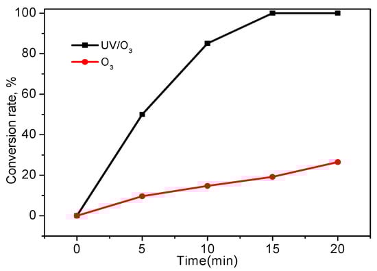 For the UV/O3 synergistic digestion scheme, pH has a great influence on the conversion of •OH in the reaction system. Under acidic conditions, only about 20% of the ozone in aqueous solution decomposes directly to •OH, whereas under alkaline conditions, the photolysis of ozone and hydroxyl ions (OH) can motivate the formation of •OH, and the conversion rate of •OH is much higher [43,44]. Experimental results are shown in Figure 5.