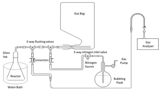 A lab scale batch system was used as anaerobic digester. The bioreactors consist of 2 main parts which are 500 mL conical flasks with an active working volume of 400 mL, and the 5 L capacity biogas compatible sampling bag (Figure 1). The connection in between those parts is provided by plastic tubing, quick release tubing connectors, and three-way valves. The system was flushed with nitrogen twice for 2 min to ensure anaerobic conditions [53,54]. Water baths were employed to keep the reactors at a constant mesophilic reaction temperature. A biogas analyser, BIOGASS 5000, was used for the qualitative and quantitative analysis of the generated biogas. The biogas quality and quantity was measured based upon DIN 2006 standard 38 414-8 explained by [54] which is commonly used for biomethane potential tests (BMP) at lab and pilot scales. The residence time was 21 days due to significant decrease in biogas generation (less than 1% of the previous measurement) after that time period.