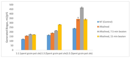 The highest biogas yields were achieved with the mixing ratio of 1:5 regardless of the condition of pre-treatments. Among the sample group with 1:5 spent grain pot ale mixing 1 M NaOH pre-treatment followed by 7.5 min beating had the highest yield of 469 ± 7 mL/g vs. with a CH4 content of 53.3 ± 1%. It also found to be significantly higher than both 1 M NaOH pre-treatment alone and followed by 15 min beating with the p-values of 0.0033 and 0.00016 respectively.