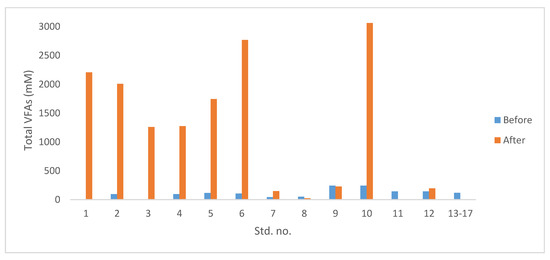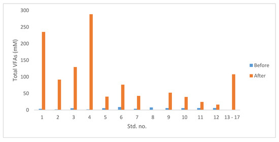 The percentage removals of the organic compounds are given in Table 7. Mainly higher COD and BOD removals were achieved with the samples seeded with 50% sludge (std. no. 7, 8, 11, and 12 in Table 7) suggesting the higher sludge amount delayed the pH drops thus methanogens could survive longer to transform the organic matter into CH4. The pH drops were explained with VFA (acetic acid, propionic acid, isobutyric acid, butyric acid, isovaleric acid, and valeric acid) accumulation in the reactors. The total VFAs concentrations before and after AD are given in Figure 4.