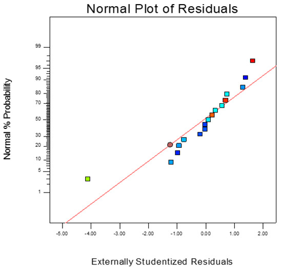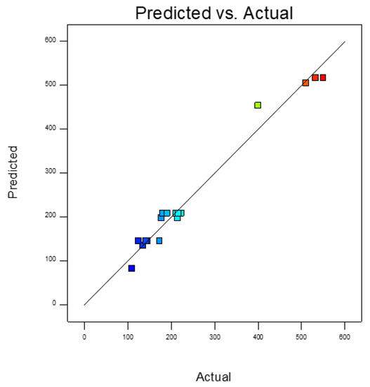 Experimental data was examined by stepwise regression and the best fit was achieved by a second order polynomial Equation (1) in order to identify the relevant mathematical model terms. Sequential F-test, lack of fit test, as well as adequacy measures were then implemented in obtaining the best models. The same statistical software was used to generate response plots [52,55,56,57]