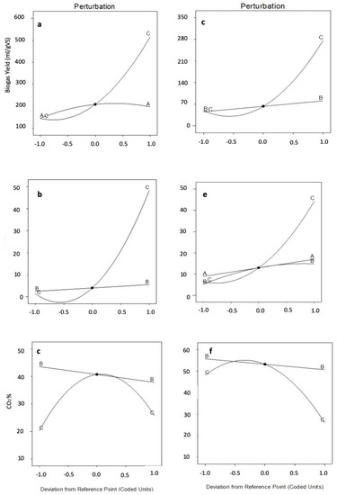 The coefficients of the final equation in terms of coded factors (Equations (2) and (3)) indicates the power of the design parameters on biogas generation as C > C2 > A2 > A and C > C2 > BC > B for AD of pot ale and spent grain pot ale mixture.
