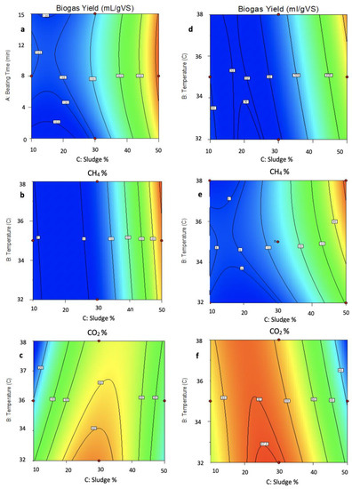 The sludge percentages had the biggest impact on all responses according to the perturbation plots given Figure 8 as well as the mathematical models in terms of coded factors. Sludge percentage was found to be the most powerful factor on interest of responses. Therefore, samples containing low sludge percentage (10 and 30%) had low biogas generation and methane quality regardless of the pre-treatment. The optimum digestion conditions were identified as 10- and 13-min beating times, 32 and 38 °C digestion temperature for AD of pot ale and AcoD of spent grain pot ale mixture respectively as well as 50% sludge seeding ratio for both cases.