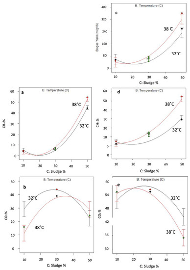 Interaction graphs for AD of pot ale and spent grain and pot ale mix on CH4% (a,d) and CO2% (b,e) respectively and on biogas yield by AD of pot ale spent grain (c).