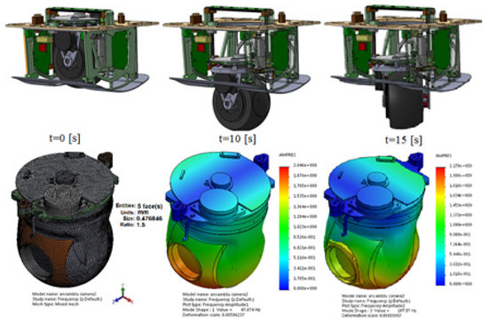 The retraction subsystem works in a closed loop. Coefficients of differential equations are time variables, so the analytical and numerical model is extremely complex, because the relationships between the flux, induced voltage, and currents change continuously when the electrical circuit is in relative motion. The movement is highlighted by a simulation of its own vibration modes [42] in Figure 4.