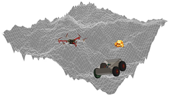 Until now, the solutions proposed in this area have been based more on theoretical hypotheses or computer simulations to demonstrate the effectiveness of a collaborative robot system [44,45,46,47]. On top of that, unmanned ground vehicles (UGVs) can be deployed to accurately locate ground targets and detect humans, fires, gases, etc., but they have the disadvantage of not being able to move rapidly or see through such obstacles as buildings or fences [19].