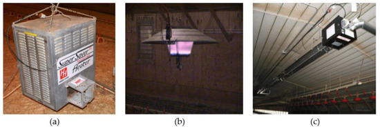 Major space heating systems in the poultry houses: (a) Forced air furnace. (b) Radiant gas heater. (c) Radiant tube heater.
