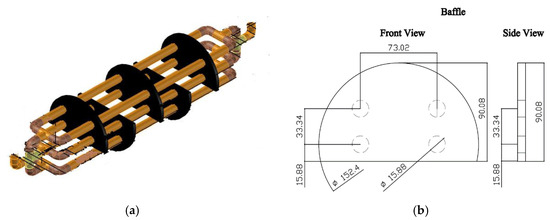 Design of the lab-scale shell and tube heat exchanger (STHE) components: (a) 3D model without shell (b) 2D baffle (units: mm).