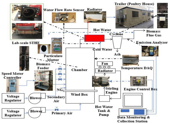 Figure 4 illustrates the experimental setup for process analysis and performance evaluation of the lab-scale STHE system during the poultry litter co-combustion process. The lab-scale STHE system was combined with the SFBC chamber, radiators (B-24.64 ECO, eComfort Holdings, Inc., Buffalo Grove, IL, USA), pump, connection pipes, and trailer (2438.4 mm width 6096.0 mm length 2438.4 mm height, Mobile Mini Storage Solutions, Middle River, MD, USA) to simulate the space heating of a poultry house. Natural gas was provided at a height of 120.0 mm for ignition and co-combustion with poultry litter. Poultry litter was fed into the chamber by the biomass feeder. In addition, the primary and secondary blowers along with a voltage regulator were responsible for supplying the combustion air. The 1 kW free piston Stirling engine (E1.4B-00001, Microgen Engine Corporation, Doetinchem, Gelderland, The Netherlands) was inserted into the SFBC system at a height of 406.4 mm to simultaneously generate electricity and heat [7,23]. Hot flue gas from the combustion chamber still carries residual heat and it was supplied into the shell. Then, it was passed through the segmental baffles to heat the water in the lab-scale STHE system. There were a total of five radiators in trailer house to mimic space heating of the poultry house in this study. The processed hot water from the lab-scale STHE system was able to supply the five radiators in series and returned as cold water into the STHE system.