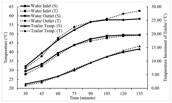 Figure 5 summarizes the effects of tube shapes (e.g., straight, twisted) on performance (water temperature, trailer temperature) of the lab-scale STHE system. S denotes the straight tube and T denotes the twisted tube in Figure 5. It was observed that CO and NOx emission was increased and SO2 emission was decreased as the mixing ratio of the poultry litter with natural gas increased from 1.89 to 7.42 [7]. Therefore, 7.08 kg/h of poultry litter was fed at the start into the combustion chamber at a mixing ratio of 2.00 to minimize gas emissions during the co-combustion process. The initial water inlet temperature was 17.8 and the water flow rate of 6.81 L/min was kept as constant. It was found that water temperature changes were similar at the beginning 30 min of the co-combustion process. After 135 min of the co-combustion process, the water inlet temperature was increased to 49.4 and the water outlet temperature increased to 62.8 in the twisted tube case. At the same time in the straight tube case, the water inlet temperature was increased to 49.4 and the water outlet temperature increased to 58.3 . It was found that the water temperature change in the twisted tube (13.4 ) was higher than the straight tube (6.9 ). This difference was made more obvious at co-combustion times of 60 min, 75 min, 105 min, and 120 min. In addition, results also indicated that the trailer temperature increased from 23.9 to 38.3 (14.4 increment), 26.1 to 38.9 (12.8 increment) using the twisted and straight tube based STHE system, respectively. In summary, twisted tubes were able to produce a higher water temperature (about 4.5 ), as well as a higher trailer temperature (about 1.6 ), than straight tubes over the course of the co-combustion process. Tan et al. [26,27] also concluded that the heat transfer coefficient for the twisted tube heat exchanger is higher than for other types of heat exchangers. Better heat performance associated with a twisted tube based STHE system was observed because the helical channel formed in the inner tube can be considered as a series of consecutive short sections to change the constant direction and interrupt the steady velocity profile of the water flow. These numerous interruptions can also achieve good transverse mixing and maintain turbulent flow to increase the high convective heat transfer coefficients while achieving better heat transfer performance than laminar flow.
