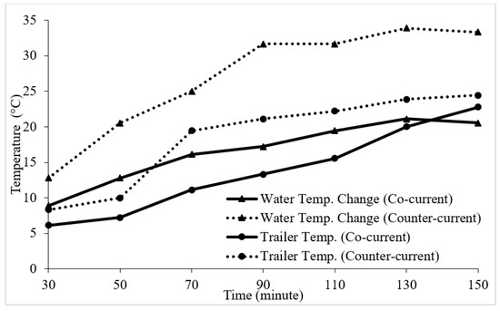 As shown in Figure 6, the effect of flow direction on the water temperature changes, LMTD, and trailer temperature by using the twisted tube based STHE system were further studied. Co-current refers to the direction of flue gas flow in the shell when equivalent to the direction of water flow. Counter-current refers to the direction of flue gas flow in the shell when opposite to the direction of water flow. In both directions, water temperature changes were sharply increased during the first 90 min and then plateauing at a constant. This is because the total heat input of fuels was kept as 42.20 MJ/h at the beginning and increased to 180.32 MJ/h by addition of poultry litter (PL = 7.08 kg/h) into natural gas (NG = 0.31 10−3 m3/s) in the remaining co-combustion process. It was found that water temperature change in the counter-current is larger than the co-current direction. For instance, counter-flow has the largest water temperature change (33.3 ) with reduction of flue gas temperature (276.6 ) while co-current has water temperature change (20.6 ) with reduction of flue gas temperature (330.4 ). Heat is transferred at a high rate throughout the entire heat exchanger with counter-current direction when compared to co-current direction. This is likely due to the high temperature difference between the cold and hot water. In addition, LMTD of the counter-current flow direction is larger than the co-current flow direction. These results imply that the heat transfer process under counter-current condition is more effective than the co-current condition. Counter-current flow extracted a higher proportion of the heat content from the heating fluid (i.e., hot flue gas) into the cold fluid (i.e., water). The possible reason may be that the hot fluid cools off to some extent but is much warmer than the cold fluid. Thus, cold water entering from right side of the STHE system could absorb heat from the hot flue gas gradually and close to the inlet temperature of hot flue gas when the cold water is moving towards the left side of the STHE system. This process may increase the possibility to achieve a higher water temperature than the co-current case. Moreover, the trailer temperature was increased from 6.1 to 22.8 with an average outside temperature of 1.38 under the counter-current condition. Under a co-current condition, the trailer temperature changed from 8.3 to 24.4 with an average outside temperature of 5.3 . To that end, counter-current direction was observed to have higher water temperature changes, LMTD, and increment of trailer temperature than co-current flow direction.
