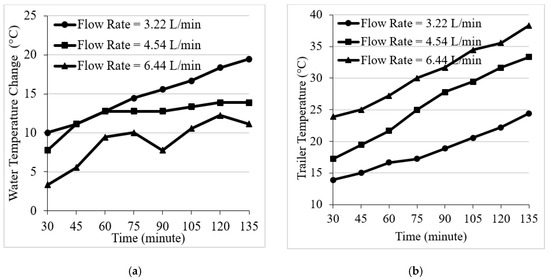 Effect of flow rates on water temperature changes of: (a) STHE, (b) Trailer.